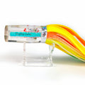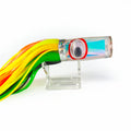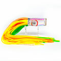 The lure's distinctive large googly eye with red outline provides enhanced visibility and triggers aggressive strikes from predatory fish species. The outer skirt comprises alternating strips of green, gold, yellow, clear, and black, creating a dynamic profile that mimics natural baitfish movement. The inner skirt features complementary strips of gold, orange, and yellow, adding depth and dimension to the lure's presentation.